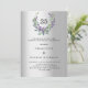 A faux silver looking background. A floral wreath made of lavender flowers and watercolored eucalyptus greenery. Personalise and add your names, details. Black text.