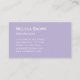 The background is lavender, the text is white. On the front, the name is written in an elegant calligraphic script. The rest of the text is in caps.