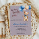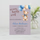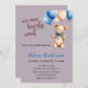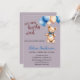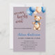 This charming baby shower invitation features a watercolor teddy bear floating with soft blue and peach balloons on a muted lavender background. With the sweet phrase “We Can Bearly Wait,” it’s a perfect way to celebrate a baby boy’s upcoming arrival. Elegant yet playful, this design is easy to personalise with your party details.