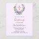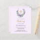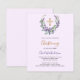 Violet background. A floral wreath made of lavender flowers, watercolored eucalyptus greenery and a golden cross. Personalise and add a name and details.