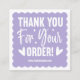 This business card features a chic scalloped square frame in soft purple lavender with a crisp white border, creating a bold and stylish design. The front showcases a typography quote that reads "Thank you for your order," adding a personal and heartfelt touch. Beneath the quote, a line of custom text provides space for your business name or tagline, making it uniquely yours.