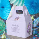 This design starts with a soft lavender background. On the front there’s an image of wedding bands and flowers. Below that is an area where you can leave a personal message to your guests. The back design has the wedding bands and flowers. It also has two champagne glasses and an area for names and the date. This favour box is good for showers, engagement parties and weddings.