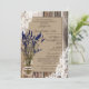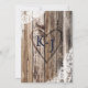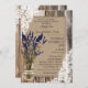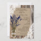 Rustic country western wedding invitation card design with navy blue lavender bouquet in mason jar wrapped with burlap, lace, and twine and white lace over linen-look background and aged wood planks and a heart etching with monogram at the back.