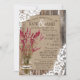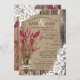 Rustic country western wedding invitation card design with red wine lavender bouquet in mason jar wrapped with burlap, lace, and twine and white lace over linen-look background and aged wood planks.