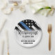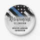 This design features a police force flag with black and white stripes, and a thin blue line stripe as well. "Retirement Celebration" sits above all of the details for the retiring law enforcement officer, sheriff, captain, or chief.
