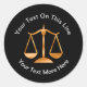 Classy Attorney law office message sticker labels with text that follows the round shape of the sticker you can customise online. Designed for a Lawyer to promote your brand, promote a message, or special event and is created with a gold tone scale of justice.