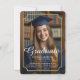 The design combines a structured scales of justice motif with an elegant ticket inspired border to frame the announcement while allowing the graduate photo to remain visible and balanced. Navy tones anchor the legal theme while gold accents add distinction without overpowering the content. This announcement coordinates with matching invitations, envelope liners, address labels and seals for a unified law graduation stationery suite.