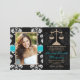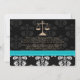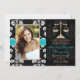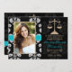 Add your photo or favourite picture to these elegant and formal black and white floral damask law school graduation announcements and invitations with a gold scales of justice design and printed turquoise bright aqua blue stitched ribbon look design. Customise it to say whatever you want on the back and front of the lawyer graduate graduation announcements and invitations. Artwork © Chrissy H. Studios, LLC. All rights Reserved.