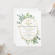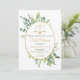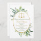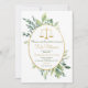Law School graduation invitation or announcement with gold accents and simple watercolor greenery frame.