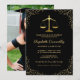 Celebrate your journey to justice with our elegant law graduation party invitations. Embodying class and refinement, these pieces boast a stylish black backdrop that can be adjusted to any hue, shimmering gold glitter, and the iconic scales of justice. With a modern, easily customisable text template and an option to feature the graduate's photo on the reverse side, these invitations are more than just a call to a party - they're a testament to your hard-earned achievement.
