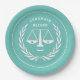 Law school grad party plates featuring creative scales-of-justice personified. To personalise edit text to add name of lawyer.