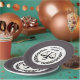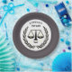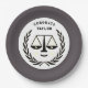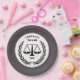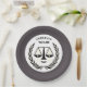 Law school grad party plates featuring creative scales-of-justice personified. Edit text to add name of lawyer.