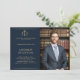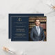 Celebrate your law school grad - or yourself - with this elegant, classic law school graduation photo invitation with a white and gold theme. Replace the scales of justice with the logo of your school or leave it as is. The contemporary typography design is elevated by the gold hues and the minimalist layout. Two gold lines (digital effect!) suggest a modern, minimalist frame for the photo. Customise every line of text. Navy and faux gold.