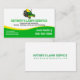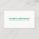Lawn service business card. with a green and yellow zero turn lawnmower on it.
