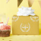 Creative lawyer giftwrap featuring funny scales of justice design pattern on a gold background.