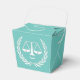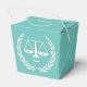 Creative lawyer or law school graduation party favours featuring funny scales of justice on teal blue background.