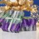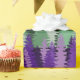 An illustration of layered pine trees arranged in horizontal bands, featuring purple, sage green, and grey shades.