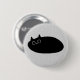 Capturing the quirky essence of feline charm! The design features a bold black silhouette of a chubby cat, depicted in a simple, almost abstract style. The cat is lying down, with its body forming a smooth, rounded shape that emphasizes its relaxed and carefree nature. Its head is slightly tilted, revealing two large, white, circular eyes and a small dot for a nose, giving it an expression of curiosity or mischief that’s both endearing and humourous.