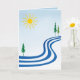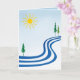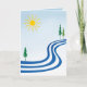 This birthday card features a simple abstract design. Float along a lazy river with the yellow bright sun shining down from a lovely blue sky and green evergreen trees along the banks. Open your mind to dreams! The text simply reads: Happy Birthday! It can be customised to suit your needs.