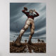 A monumental Art Deco oil painting from an extreme worm's-eye view, depicting a heroic female quarterback as a mud-caked colossus, her stylised geometric form rendered in gritty, sepia-toned monochromes and defined by moody, diffused lighting against an oppressive slate grey sky.