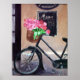 An original painting of a French country setting. A bicycle with a basket of bright pink flowers in front of a restaurant.