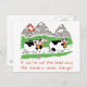 "If you're not the lead cow the scenery never changes." Humourous cartoon cows parade through green pastures with edelweiss at the foot of the Alps.