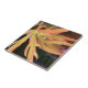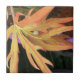The image on this small Ceramic Tile is an original closeup photograph by HomeWare of a leaf on a young coral plant. The plants have palmate leaves whose leaflets have notched edges. After a shift in colour, the leaf looks reddish gold. The flower pots have become purple, all against a dark brown and green background.