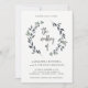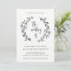 This modern botanical wedding invitation features a watercolor wreath of leaves in trendy shades of green, blue, and grey for a stylish look that is both minimalist and rustic.