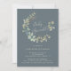 This elegant gender neutral baby shower sprinkle invitation features a simple, leafy green botanical wreath, with faux gold line art in the shape of a flower and leaves. Stylish calligraphy is also featured along with modern text on a slate coloured (dark blue tinged grey) background.