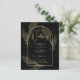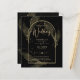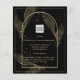 Introducing a softly formal black tie wedding item with black and gold colors adorned with delicate gold skeleton leaves overlaying the borders of an arched frame. This design is part of a coordinating collection and includes items such as RSVP cards, save the dates, invitations, welcome signs, stickers, napkins, programs, table number cards, favor bags, menus, and wine bottle labels, as well as a variety of card and paper types to fit any budget.
