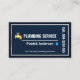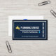 Design features a blue cover with a faux silver rectangular frame. At the centre is a border pipe line that is dripping water from the gold faucet. Just above this lies the business name "PLUMBING SERVICE" with your prestigious name just underneath. Near the base of the card lies a slogan caption which you can change.