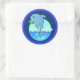 A cartoon illustration of a cute dolphin jumping out of the ocean in shades of blue and green. Sticker has a wide border in blue with a wavy pattern in varying shades of blue.