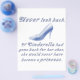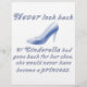 Never look back. If Cinderella had gone back for her shoe, she would never have become a princess. Live every day to the fullest, and never look back; no matter how bad something may appear, there is no telling what good may come of it. You only live once, don't waste time on regrets! A lovely design with glass-like writing, and of course, the iconic Cinderella's glass slipper.