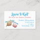 Business card for a knitting teacher. “Learn to Knit” is the sample text in blue on white cards. A pair of knitting needles with knitting swatch and ball of yarn is the image on the front with three templates for adding personal name, business name, location, contact, or whatever you need. Text is light blue and one line of pink. A fun yarn balls and cats pattern covers the back of the cards. This business card design can also be used by a knitwear designer, fiber artist, craft shop, or yarn seller. The design will fit well on other sizes that have a similar shape.