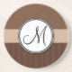 A seamless digital pattern image of tan and terra cotta damask on top, and aged vintage brown leather style stripes on the bottom, with a ribbon overlay with a customisable monogram text seal.