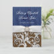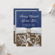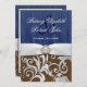 Leather & Denim Damask Western Wedding Invitations---match the RSVP cards and more found below on this page. Each invitation features s floral leaf damask print in silver gradient over a printed brown leather background. The front and back also feature a printed white band with a diamond embellishment. These wedding invitations are set to high quality basic card stock; however, you can change the stock to linen, felt (embossed), recycled, and several metallic shades if you would like under number 2 (choose your style, size & paper type) below the orange add to cart button. A list of the additional costs for a fancier card stock are displayed also under that option. Each invitation comes with a fitted white envelope.