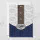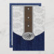 Leather & Denim Western Lace Wedding Invitations---match the RSVP cards and more found below on this page. Each invitation features a lace and denim design. The front also features a printed leather band with diamonds, along with a silver gradient monogram that you can customise to the groom's last initial. These wedding invitations are set to high quality basic card stock; however, you can change the stock to linen, felt (embossed), recycled, and several metallic shades if you would like under number 2 (choose your style, size & paper type) below the orange add to cart button. A list of the additional costs for a fancier card stock are displayed also under that option. Each invitation comes with a fitted white envelope.