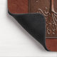 An intricate tree design that features tribal swirls in the branches and roots. The symmetrical pattern sits on a red leather background inside of a rectangular frame
