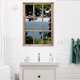 This lovely sea view is framed not just by a fake wooden window frame, creating a picture that looks like a window, but also by the green leaves of the nearby trees. What a wonderful way to give yourself a room with a view. There is a ship on the horizon of the blue ocean and you can see just a little sky too.