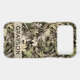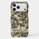 Customise this leaves camouflage iPhone 17 pro max case with your name in a trendy modern CAP font in brown on opaque cream. It's masculine and perfect for your favourite military, hunting, country or outdoorsman!