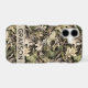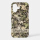 Customise this leaves camouflage iPhone 17 case with your name in a trendy modern CAP font in brown on opaque cream. It's masculine and perfect for your favourite military, hunting, country or outdoorsman!