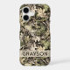 Customize this leaves camouflage iPhone 17 case with your name in a trendy modern CAP font in brown on opaque cream. It's masculine and perfect for your favorite military, hunting, country or outdoorsman!