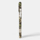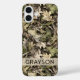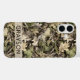 Customize this leaves camouflage iPhone 16 plus case with your name in a trendy modern CAP font in brown on opaque cream. It's masculine and perfect for your favorite military, hunting, country or outdoorsman!