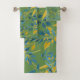 Beautiful pattern features branches of leaves in blues and golds on green background, complimenting a variety of home decor themes from mid-century to modern.