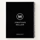 Modern left-handed notebook features a minimal design in a classic black and white colour palette. Custom name presented in the centre in stylish simple font with a complimentary minimal monogram medallion. Shown with a custom name and monogram initial on the front in modern typography, this personalised business notebook is designed with custom text you can customise by changing the text using the fields provided. The spiral is on the right for left-handed convenience.