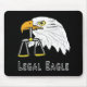 Legal Eagle design shows a keen-eyed eagle holding a pair of scales. A pun and play on the expression "Legal Eagle" creating a fun graphic for lawyers and anyone involved with the law and legal professions.