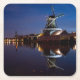 Photo paper coaster with the windmill 'Salamander' with reflection in the water of the Vliet river with lights on at the beginning of the night in the city of Leidschendam in the Netherlands.