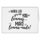 "When life gives you lemmas...make lemma-nade!" This fun phrase is a pun on the proverbial phrase "When life gives you lemons, make lemonade." The words appear in black typography, in a combination of printed and script brush (brushstroke) fonts. Makes a great gift for mathematicians or linguists!