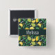 Button with a cute pattern featuring yellow lemons and green lime fruit with stalks of leaves set on a dark green background.