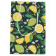 Gift bag with a cute pattern featuring yellow lemons and green lime fruit with stalks of leaves set on a dark green background.
